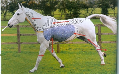 - Ieelpošana: kad iegurnis izstumj pakaļkājas zem zirga ķermeņa, galva un kakls paceļas, iekšējie orgāni pārvietojas uz aizmuguri, lāpstiņa izstumjas uz priekšu un krūšu kurvis izplešas, tādējādi vairāk gaisa ir iespējams ievilkt plaušās.