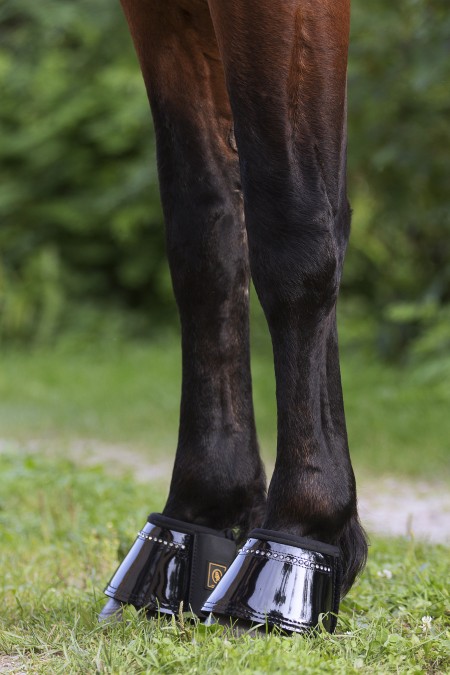 „Zvanu” tipa kājsargi tiek izmantoti, lai pasargātu zirga nagus no sišanās vienam pret otru, kā arī, lai nepieļautu pakavu noraušanu, ja zirgam ir tendence pakaļkāju solī likt ļoti tuvu priekškājai. Kājsargi, kurus saņēmām šomēnes, ir holandiešu firmas „BR” ražojums. „BR” jātnieku vidū ir populāra firma savu izturīgo un kvalitatīvo vēzīšu kājsargu dēļ, taču uzņēmums ražo pilnīgi visu veidu zirglietas. Konkrētie kājsargi, kuri nonāca mūsu rokās, atšķiras no citiem to dizaina dēļ. Ja esam pieraduši redzēt vienkrāsainus un no parastas gumijas ražotus „zvanus”, tad šoreiz „BR” mūs patīkami pārsteidza – konkrētie kājsargi ir ar spīdīgu, lakotu pārklājumu, kā arī dekorēti ar spīdīgiem, elegantiem akmentiņiem, kuri izvietoti „zvana” augšdaļā un izskatās patiešām gaumīgi. Paņemot kājsargus rokās, patīkami pārsteidz to aizdaru kvalitāte. „Velcro” materiāls ir sašūts ļoti kvalitatīvi un stingri, aizdares pāris reižu attaisot un aiztaisot, nerodas aizdomas, ka šuvju vietas varētu būt neizturīgas. Visvairāk mūs, protams, māca šaubas par dekoratīvo akmentiņu noturību – tie ir maziņi un no pirmā acu uzmetiena liekas, ka tik smagām slodzēm, kā zirga kāju sitieni, nepiemēroti, taču to mēs arī uzreiz devāmies noskaidrot – kājsargus kājās (zirgam, protams) un prom uz laukumu!